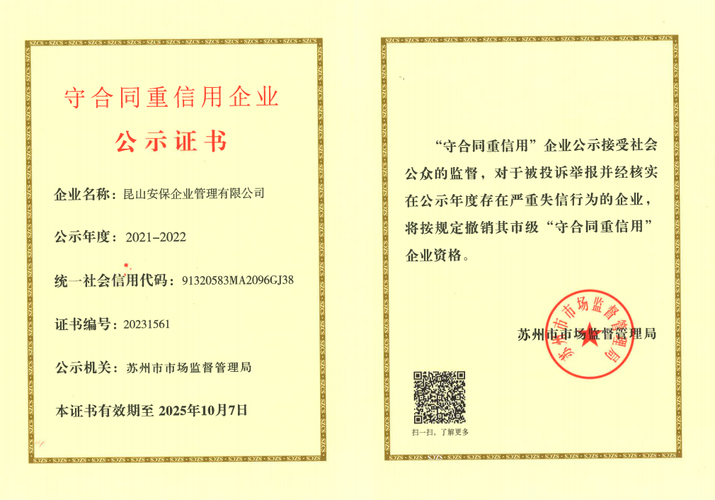 近期,昆山安保企業(yè)管理有限公司獲得蘇州市工商行政管理局2021-2022年度“守合同重信用”榮譽稱號。“守合同重信用企業(yè)”是市場監(jiān)管部門對安保公司在誠信經(jīng)營、合同履約等方面的充分肯定。安保公司一直以來堅持誠信經(jīng)營理念,始終高度重視企業(yè)誠信體系和合同制度體系的建設(shè),以誠取信、以信立譽,不斷強化和完善合同管理制度、流程,提高合同信用的管理水平,規(guī)范管理行為,在促進(jìn)經(jīng)濟(jì)發(fā)展等方面作出了積極貢獻(xiàn),贏得了廣泛認(rèn)可。