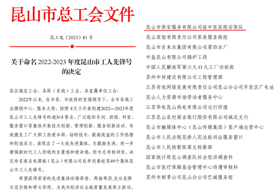 安保公司駐中醫(yī)醫(yī)院安保隊(duì)榮獲“2022-2023年度昆山市工人先鋒號(hào)”稱號(hào)