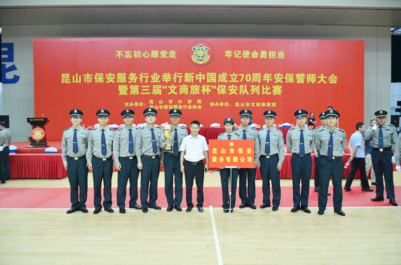 8月28日下午,昆山市保安服務(wù)有限公司參加昆山市保安服務(wù)行業(yè)協(xié)會舉辦的“新中國成立70周年安保誓師大會”暨第三屆“文商旅杯”保安列隊比賽并成功摘奪桂冠。