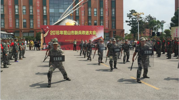 據(jù)悉,此次昆山市共有273名新兵入伍,參加本次歡送會(huì)的新兵共有100名。在歡送會(huì)中,公司民兵訓(xùn)導(dǎo)中隊(duì)為新兵們帶來了擒敵拳、警棍盾牌操等表演,隊(duì)員們精彩的表演贏得了現(xiàn)場(chǎng)陣陣掌聲。昆山市人武部殷珊奇部長在會(huì)后對(duì)訓(xùn)導(dǎo)中隊(duì)的表現(xiàn)特別作出了表揚(yáng)及肯定,并希望民兵訓(xùn)導(dǎo)中隊(duì)能繼續(xù)保持良好的精神風(fēng)貌,爭(zhēng)做昆山民兵中的特種隊(duì)伍。