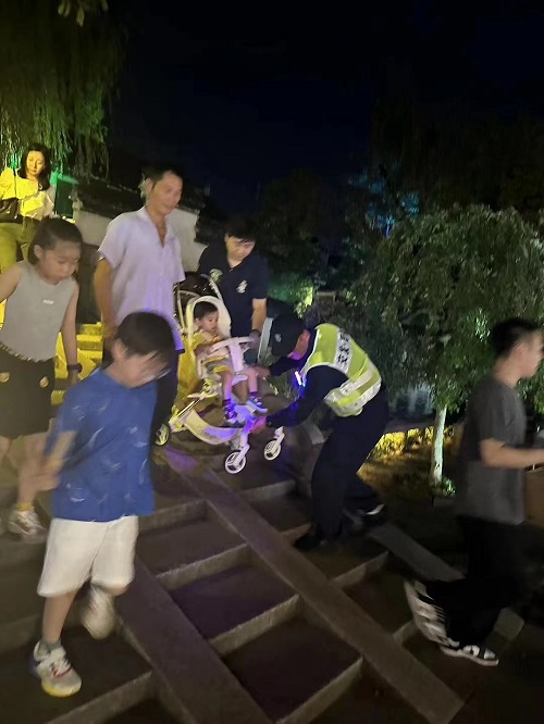 10月7日晚上19點左右,在周莊古鎮(zhèn)內(nèi)一名游客獨自帶著小朋友從周莊古鎮(zhèn)景區(qū)出來,在下青龍橋的時候,由于兒童推車有點不好推下去,為保護(hù)兒童安全,游客走的小心翼翼,安保公司下屬保安員發(fā)現(xiàn)后立即上前幫忙一起把兒童推車抬到平地上。