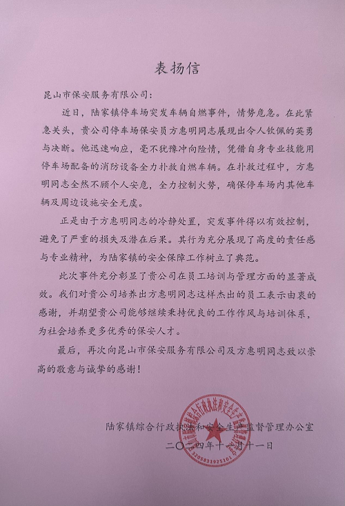 11月9日,昆山市保安服務(wù)有限公司駐陸家光夏路停車場(chǎng)保安員方惠明在處理車輛自燃火災(zāi)事故中冷靜應(yīng)對(duì)、英勇?lián)渚?,得到了陸家?zhèn)綜合行政執(zhí)法和安全生產(chǎn)監(jiān)督管理辦公室的高度肯定和贊揚(yáng)。當(dāng)天下午16:30左右,駐點(diǎn)保安員方惠明在例行巡查停車場(chǎng)時(shí),陸家鎮(zhèn)光夏路停車場(chǎng)內(nèi)一輛客車,車頭突然出現(xiàn)自燃現(xiàn)象。該客車旁邊還停放著其他車輛,情況十分危險(xiǎn)。保安員方惠明立即撥打119、110電話,同時(shí)啟動(dòng)應(yīng)急預(yù)案進(jìn)行火災(zāi)初期的撲救工作,在撲救過程中,方惠明同志全然不顧個(gè)人安危,接連使用2個(gè)手提式干粉滅火器、1個(gè)推車式滅火器,全力控制火勢(shì),確保停車場(chǎng)內(nèi)其他車輛及周邊設(shè)施安全無虞。