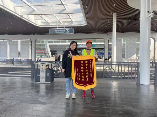 11月9日下午,保潔員李菊英在昆山南站門廳公共衛(wèi)生間洗手池旁撿到一個黑色女士手抓包及相關(guān)工作證件,詢問周圍無人認(rèn)領(lǐng)后,第一時間將手抓包妥善保管,并上報給項目經(jīng)理。項目經(jīng)理通過工作證上信息聯(lián)系到失主,當(dāng)時失主已坐車前往無錫,于是雙方立即約定歸還時間和地點。于11月12日上午9點,保潔員李菊英在昆山南站門廳處親手將手抓包歸還給失主陳女士,陳女士在確認(rèn)包內(nèi)物品完好無損后,對保潔員及相關(guān)工作人員表達(dá)了誠摯的感謝并送上錦旗。
