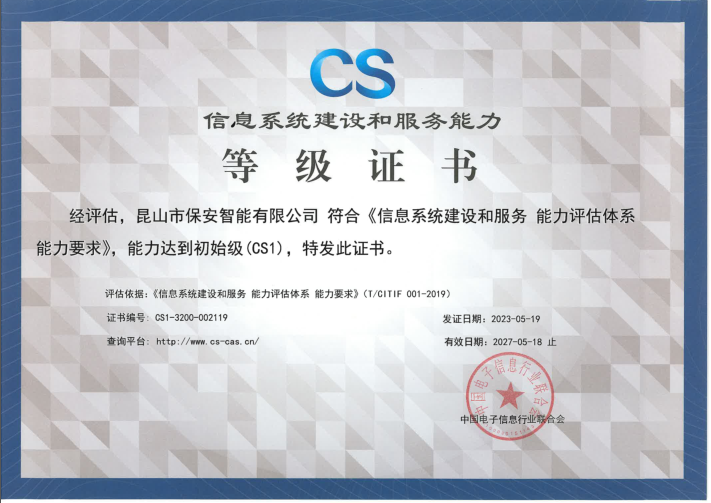 喜報!保安智能公司成功取得信息系統(tǒng)建設(shè)和服務(wù)能力CS1證書